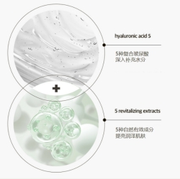 低/中/高分子5重复合玻尿酸的深度补充和5种自然有效成分使肌肤明亮润泽